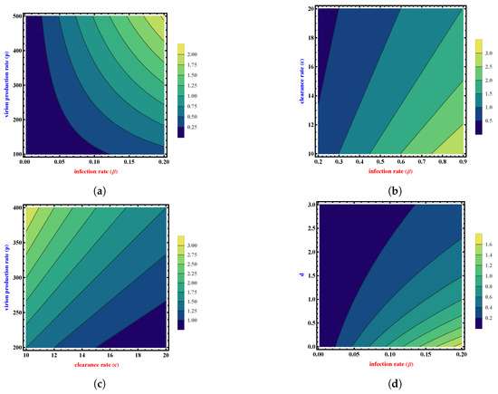 Contour plots of the basic reproduction number for various parameter values. (a) Contour plot of as a function of and p. (b) Contour plot of as a function of and c. (c) Contour plot of as a function of c and p. (d) Contour plot of as a function of and d.