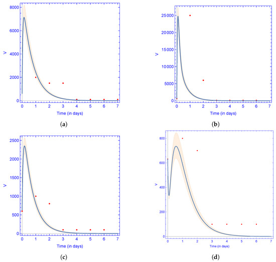Virus curve (blue line) represents the model (1) prediction, while the red dots indicate the experimental data points, with a confidence interval, which was obtained by letting for all parameters a 5% relative error with respect to the best fitting values. Parameter values are given in Table 3. For details of the experiments, see [15,41]. Subfigures correspond to the following experiments in [15]: (a) B7 (b) B16 (c) B25 (d) B31.