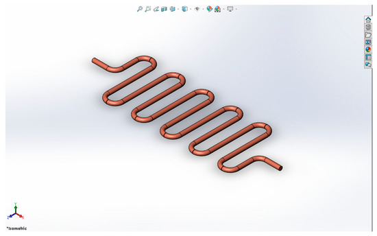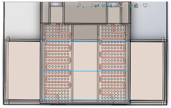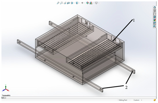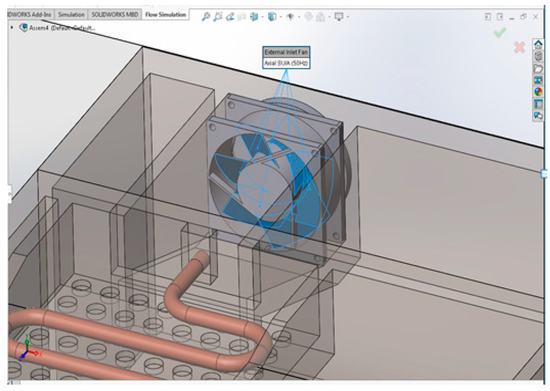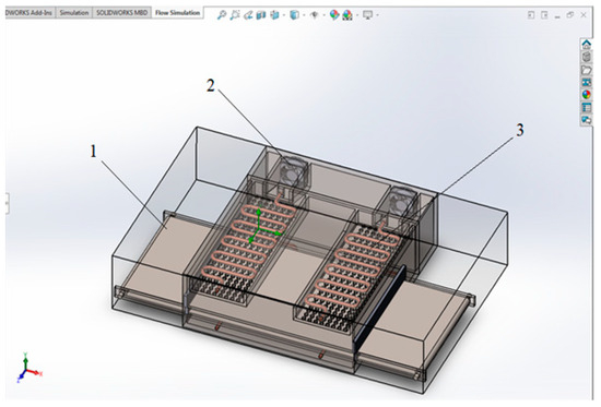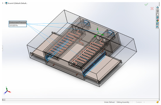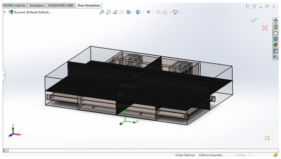 After making the assembly, it was introduced in the “Flow Simulation” module to perform the analysis of air flow inside the baking chamber. As only the flow of air inside the oven was concerned, all connections to the external environment (the product supply and outlet ports, as well as the air supply openings for the fans) were closed with the help of lids, as shown in Figure 5.