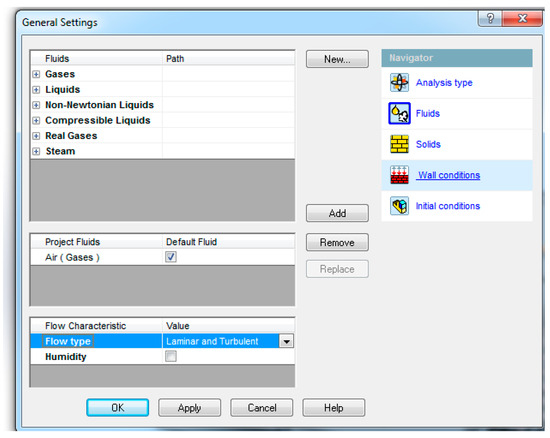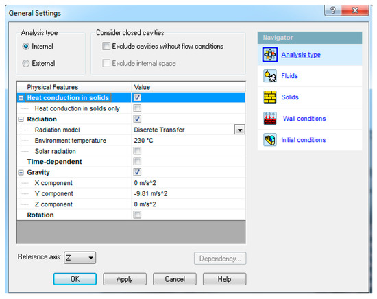 After isolating the inner volume of the chamber, the type of analysis was chosen, as well as the physical parameters, the type of fluid, and the material from which the baking chamber was made. Also chosen were the initial thermodynamic parameters and the thermal conditions of the process; see Figure 6, Figure 7, Figure 8 and Figure 9.