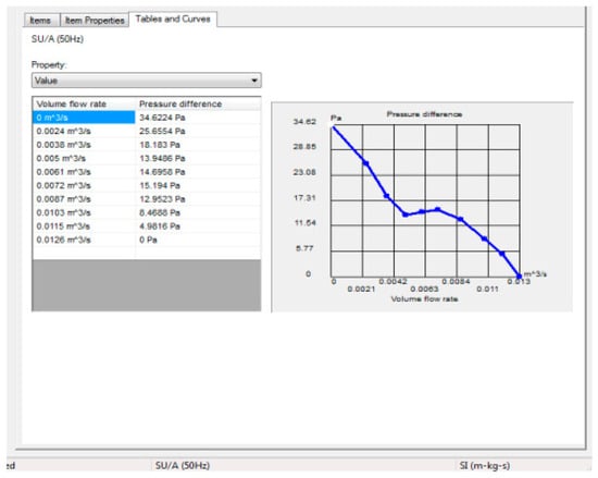 Then, on the surfaces of the blades of the two parametrically shaped fans, we set the virtual characteristics of an axial fan, Comair Rotron, powered in an alternating current, model SU/A (50 Hz). This fan was chosen because the features were the same as the characteristics of the actual fan, mounted on the electric oven, on which the experimental validation was done, but which was not found in the SolidWorks program library. Both fans had been set to introduce air into the electric oven baking chamber. Figure 11 shows the arrangement of the fans, and Figure 12 shows the variation of the air flow with the pressure difference of the chosen fan.