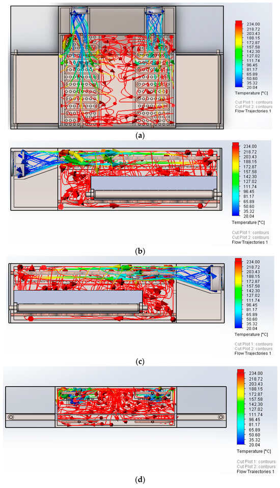 After performing the analysis, the program recorded in its own database the circulation of air and temperature inside the baking chamber. The simulation results took into account the initial conditions set and presented above. Thus, Figure 14 shows the distribution of air currents inside the oven, through several views.