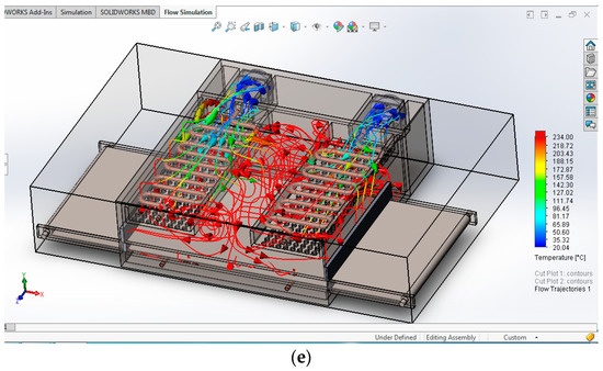 Distribution of air currents inside the baking chamber: (a) top view; (b) view from the feeding area with baking product; (c) view from the outlet area of the baked product; (d) front view; (e) isometric view.