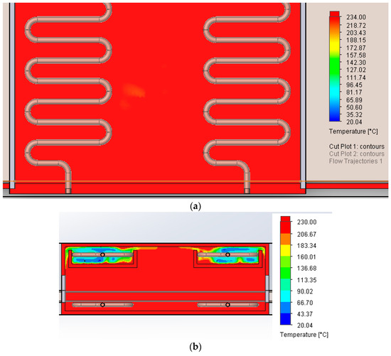 From Figure 14, it can be seen that in the middle area of the oven there were created air vortices which caused the temperature in the middle area of the conveyor in the longitudinal plane to decrease to a value of 170–180 °C, under the conditions in which the operating mode requires a baking temperature of 230 °C. This is mainly due to the entrainment of cold air currents, which enter the baking chamber and are entrained in the vortex movement inside. This phenomenon can also be observed in the temperature distribution at the level of the conveyor belt (Figure 15). Chhanwal, N. et al. and Kokolj, U. obtained the same results in their paper [5,23].