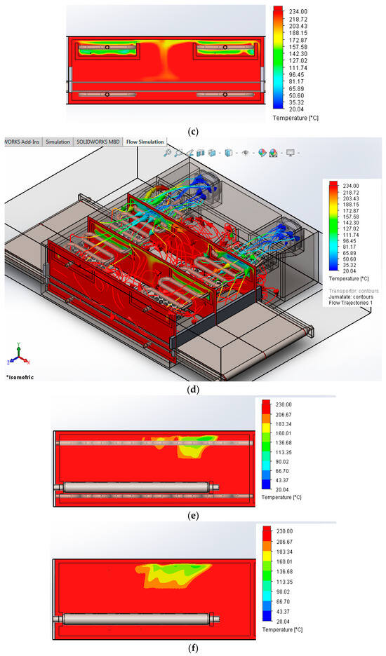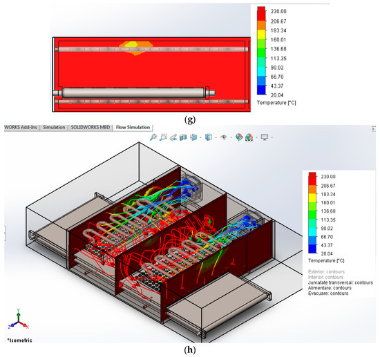 Temperature distribution in the oven for some characteristic sections: (a) temperature distribution at the conveyor belt level; (b) temperature distribution in the supply area of air in the baking chamber (longitudinal section); (c) temperature distribution in the area opposite to the air supply in the baking chamber (longitudinal section); (d) temperature distribution in the three areas shown above along with the trajectories of the air currents (isometric view); (e) temperature distribution in the feeding area of the baking chamber (cross section); (f) temperature distribution in the outlet area of the baking chamber (cross section); (g) temperature distribution in the middle zone of the baking chamber (cross section); (h) temperature distribution in the three areas shown above along with the trajectories of the air currents (isometric view).