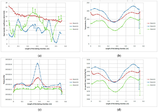 It was noted in Figure 16 with Sketch 1, the longitudinal line of the conveyor inside the baking chamber located on the opposite side of the air supply, with Sketch 3, the longitudinal line located in the middle area of the conveyor inside the baking chamber, and with Sketch 2, the longitudinal line located near the feeding area with air inside the baking chamber. All three lines were located on the surface of the conveyor and were used to collect data on the variations of the heat transfer coefficient (Figure 16a), air temperature (Figure 16b), air pressure (Figure 16c) and the specific heat of the air (Figure 16d) along the length of the baking chamber. Figure 17 shows the three lines used to collect the numerical values that define the variation curves in Figure 16.