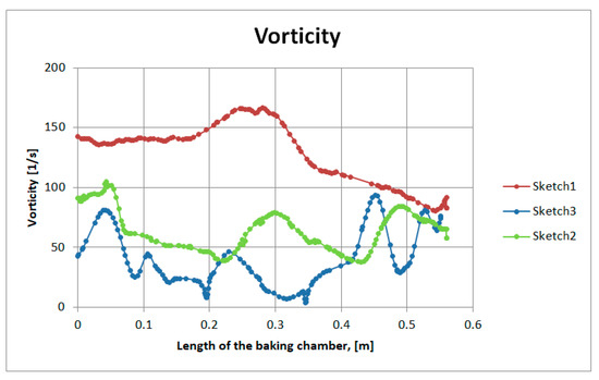 In the case of the analyzed electric oven, the vorticity (on the three areas presented above) is represented in Figure 18. It can be seen that the vorticity has higher values in the area opposite to the air supply because here the air current hits the vertical wall of the baking chamber and begins to create vortices. Also, it can be observed here that the maximum value of vorticity appears again in the area near the middle of the baking chamber along its length. The results are similar to those obtained by the authors of [25], in which the authors showed a temperature and vorticity gradient with variations identical to the one in this article. It should be mentioned, however, that in the study in [25], this gradient was beneficial to the working process of the oven analyzed, and while it was not in the oven used in this article, this is why we recommend mounting deflector plates in this area.