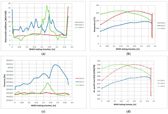 Figure 19 shows with Line 1 the transverse line of the conveyor in the oven outlet area, with Line 3 the transverse line located in the middle area of the conveyor, and with Line 2 the transverse line of the conveyor in the supply area. This figure shows the variation data of the heat transfer coefficient, air temperature, air pressure and air-specific heat in the transverse plane of the baking chamber.