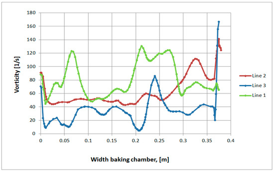 Figure 20 shows the vorticity variation across the width of the baking chamber in the three areas mentioned above. It can be seen that, for the supply area, the maximum values were close to the area of the first fan. In the case of the discharge zone, the vortex variation curve shows maximums towards the left and right ends of the discharge surface, with the vortices being small in the central zone. And, in the case of the line in the middle area of the baking chamber, in width, the maximum was reached at about 0.24 m from the outer wall.