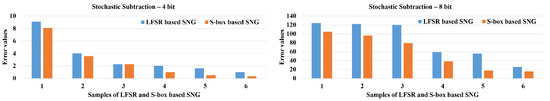 | LFSR-based stochastic subtraction—8 bit | S-Box-based stochastic subtraction—8 bit | ||||