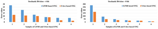 | LFSR-based stochastic division—8 bit | S-Box-based stochastic division—8 bit | ||||