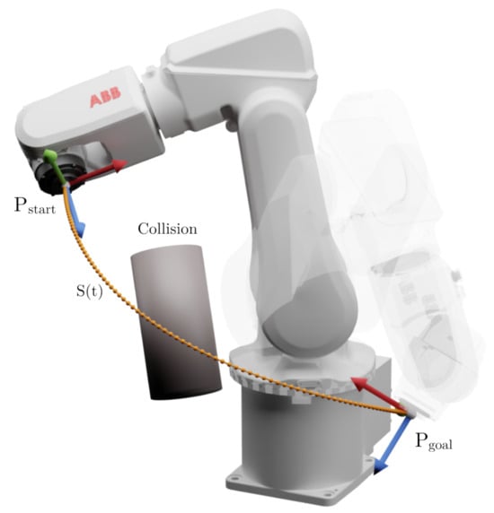 Recently, the field of robotics has attracted increased attention due to its prevalence in scientific and engineering applications, such as underwater and space exploration, welding, painting, assembly and medical applications, industrial and military uses, and many others [1]. Robot manipulators perform point-to-point motions under kinematic and dynamic constraints stemming from their geometry. Due to the coupling characteristics of multiple degrees-of-freedom (DOF), it is generally difficult to find a control for the robot manipulator that would precisely follow a desired trajectory [2]. This path planning problem, with its schematized depiction in Figure 1, is one of the most fundamental and challenging research topics in the field of industrial robotics, and it has received considerable interest from research institutions and industrial companies in recent decades. Traditionally, the two main formulations of the path planning problem for robotic manipulators use either the configuration space (C-space) representation or the kinematic model [3]. In the C-space representation, the path of the manipulator is reduced to the motion of a single point that moves in an n-dimensional space, where n is the number of links of the manipulator [4]. The approaches using the kinematic model of the manipulator combine path planning and redundancy resolution by solving the relationship between joint and task space motion [5].