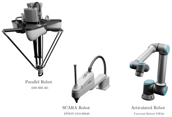 In the field of industrial robotics, one commonly encounters three basic types of robots [31]. Firstly, the parallel robot (also known as a delta robot) is a highly specialized robot widely used in various industries [32]. Its unique design typically consists of three arms connected to a fixed base in a triangular configuration. Delta robots are a popular choice in environments where hygiene and cleanliness are crucial due to their sealed design.