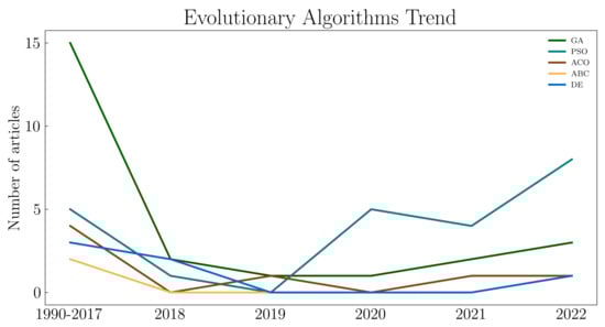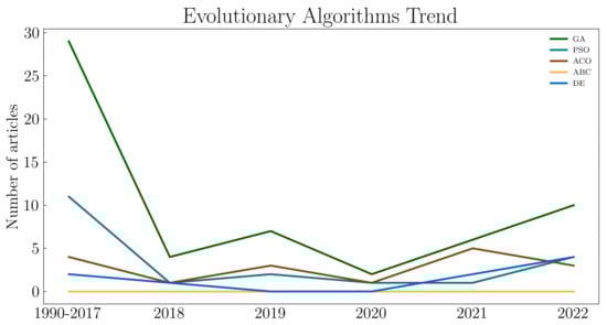 An approximate trend in the utilization of the presented evolutionary algorithms is mentioned in this article. The trend indicates that the most commonly used evolutionary algorithms for robot trajectory planning are undoubtedly PSO and GA.