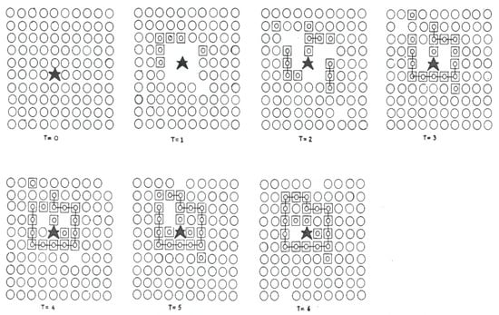 We begin this section with HighLife because it has a “replicator” that has the same pattern as the sequence of productions of protocells in the recursive distinctions of the previous section. See Figure 12 for an illustration. The details of the pattern in HighLife are more complex than in the recursive distinguisher. It would be an interesting and significant project to analyze the relationships between these two recursions.