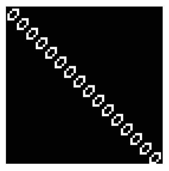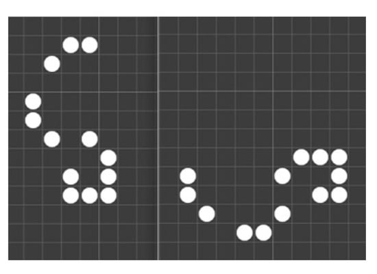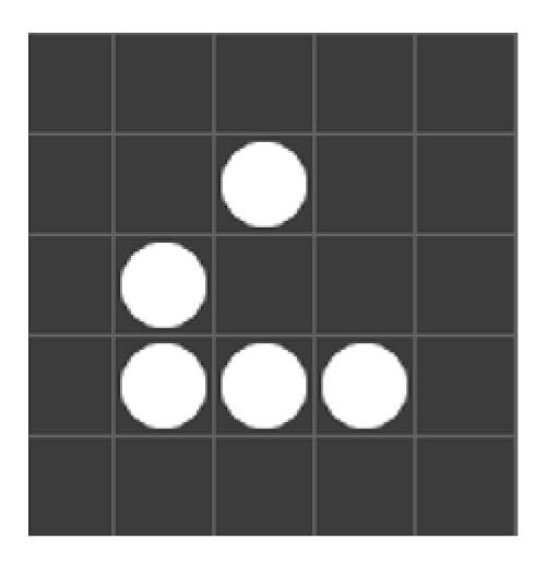 In Figure 13, we see a configuration of 5 points (I will refer to white squares as points) that is called a glider. When the recursion is applied twice, the glider is transformed into a mirror image version of itself, and in two applications of the recursion the glider is transformed into a copy of itself that is shifted diagonally down the board by one vertical step and one horizontal step. Thus, the glider reproduces itself and “moves” down the board.