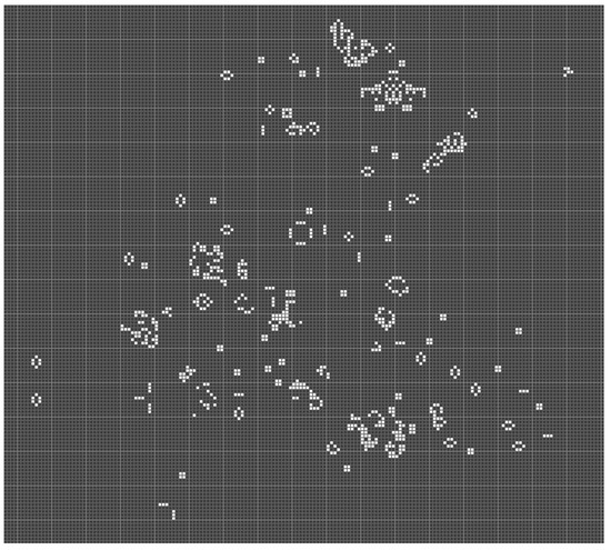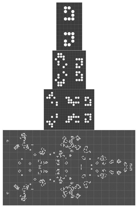 Note that the configurations in Figure 16 appear to have a number of clusters that can be regarded as protocells. These clusters change shape and are seen to interact with one another as the recursion goes forward. They coalesce, emit gliders and generally engage in complex dynamics. One can experiment with the dynamics by changing the rules. For example, Conway Life has rule B3/S23. If we remove the rule of (born on) 7 in Life7, we obtain Conway Life. Then a configuration such as the above will lose its dynamism and become a collection of separate small entities that are either unchanging or periodic.