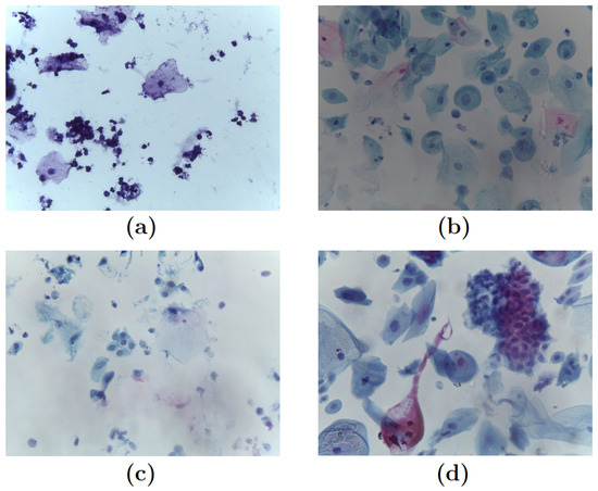 Pap smear samples: (a) Negative for intraepithelial lesion or malignancy (NILM). (b) Low-grade intraepithelial lesions (LSIL). (c) High-grade intraepithelial lesions (HSIL). (d) Squamous cell carcinoma (SCC).