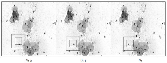 The figure illustrates a stack of frames, visually representing the environment in which an agent interacts. The agent is characterized by two black squares and the motion it exhibits within the frames.