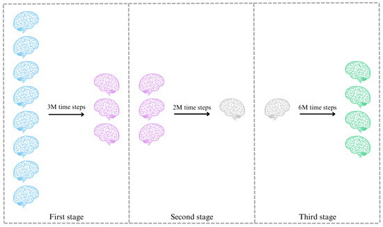 Finally, the selection of agents for further consideration relies on their performance throughout the training process. To facilitate this selection, a multi-stage approach is implemented, involving three distinct stages for rejecting agents and not well-defined reward signals. This process aims to identify the most promising agents from each stage and subject them to retraining in subsequent stages, see Figure 9.