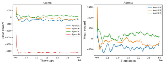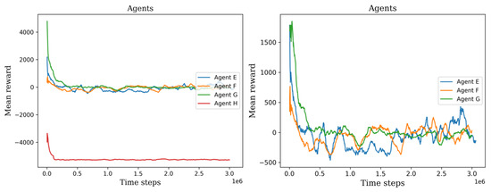 The left plot shows all the first set of agents’ mean rewards, permitting the ability to visually compare their training process. The right plot shows only three agents, agent D was not considered because it has the lowest values.