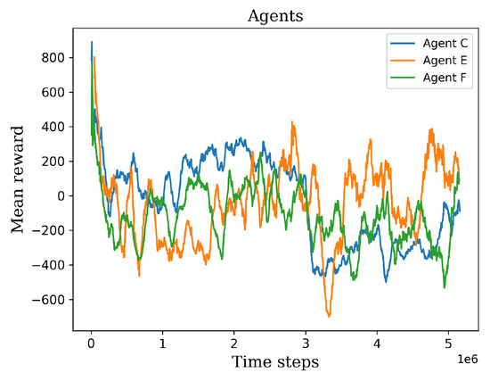 In this stage, agents C, E, and F were selected based on their superior performance, as they consistently achieved higher mean rewards compared to the other agents. These selected agents underwent an additional two million time steps of retraining, leading to diverse outcomes, as depicted in Figure 12. Agent E emerged as the standout learner during this stage, exhibiting positive mean rewards and surpassing the performance of the other agents. However, it is worth mentioning that in one particular environment, agent E obtained lower values compared to the other environments. After that lowest value, the agent began to recover its policy and exhibit improved results. On the other hand, agents C and F consistently obtained negative mean rewards in the majority of environments, leading to their exclusion from the final stage. The negative mean rewards obtained by agents C and F indicated a lack of effective policy and performance in various environments. These agents were therefore considered unsuitable to advance to the final training level.