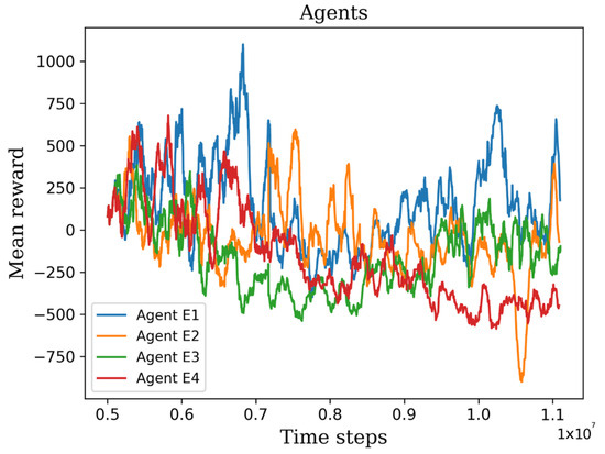 In this stage, agent E underwent parallel retraining for 6 million additional time steps, carried out four times, see Figure 13. Surprisingly, as depicted in Figure 5 and Figure 6, despite employing identical hyperparameters and a shared pre-trained model, the learning process exhibited variability. This variation can be attributed to the use of a stochastic algorithm, which generates a policy based on action probabilities rather than deterministic choices. The stochastic nature of the algorithm introduces randomness into the learning process, resulting in divergent training trajectories. As a result, each retrained agent may exhibit unique patterns of improvement and performance. From the four retrained agents, it is possible to select one agent that achieves superior results compared to the others. This selection is based on the agent’s ability to optimize its policy and achieve higher performance scores. This highlights the importance of evaluating and identifying the most successful agent among multiple retraining iterations.