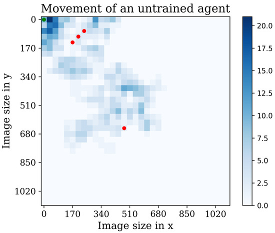 Addressing some limitations of the system, it is essential to note that the use of the PPO algorithm introduces a stochastic element due to its implementation of a stochastic policy, relying on a probability distribution to guide the agent’s actions [9]. This inherent randomness implies that agents trained under identical hyperparameters and conditions may exhibit diverse behaviors. To accurately assess an agent’s efficiency or performance, it becomes necessary to train the same agent multiple times. In this study, eight different agents were trained, Figure 9, and their behaviors were examined at various stages of training. Additionally, it is crucial to consider that the number of samples required for achieving robust results can be substantial and varies depending on the context. For instance, control tasks may necessitate hundreds of thousands to millions of time steps for an agent to learn effectively [23], and Atari games often demand millions of time steps [24]. Given that the dataset comprises 1080 × 1080 pixel images, the training process duration is influenced by the image size, and the scale of the environment is notably larger compared to other reinforcement learning studies such as those mentioned before. Therefore, the agents were trained for 11 million time steps, a duration that, while demonstrating promising results and observable searching behavior in the last three agents, may still be subject to further optimization. In the future, the complexity of the environment could be mitigated through the implementation of various techniques, including the application of thresholds, Gaussian blur, and a grayscale transformation [25]. These methods have the potential to simplify the environment by reducing unnecessary details and emphasizing key features, thus facilitating more streamlined processing and analysis. This strategic simplification could contribute to improved efficiency and performance, making the system more adaptable and responsive to the nuances of the environment it interacts with, while the ResNet50 model exhibited a high accuracy percentage and favorable metrics across different dataset categories, it is prudent to acknowledge that there is room for improvement in future models. Achieving greater precision and accuracy remains a prospective avenue for enhancement such as [19].