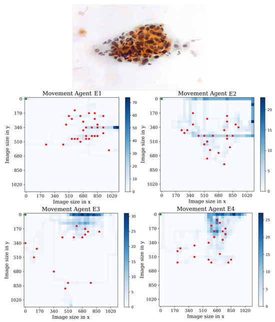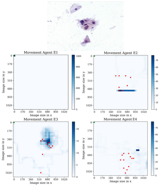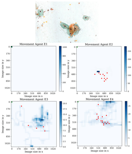 In the first environment, see Figure 16, it is interesting to observe that agent E1 displayed no behavior in the first environment, despite achieving higher mean rewards in training compared to the other agents in multiple environments. By analyzing the heatmap plots of agents E2 and E4, we can observe that these agents actively search for cells but eventually become trapped in a repetitive loop of actions. On the other hand, the heatmap plot of agent E3 shows a notable performance, as it covers a larger area compared to the other agents and successfully detects nearly all the cells present in the sample. Additionally, agent E3 exhibits a maximum of 20 passes through the same position, indicating efficient exploration and reduced redundancy in actions. Overall, these observations suggest that agent E3 demonstrates superior performance in terms of coverage, cell detection, and avoidance of repetitive behavior in the given environment.