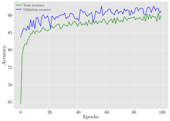 ResNet-50 behavior in training and validation accuracy during 100 epochs.