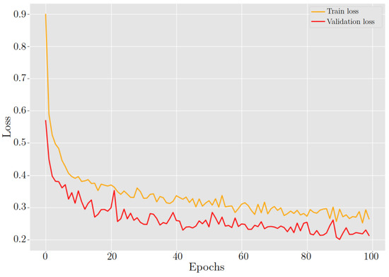 ResNet-50 behavior in training and validation loss during 100 epochs.
