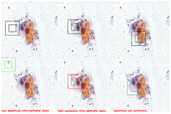 The figure demonstrates three instances in which the agent successfully detects cells and accurately classifies them. The agent detected LSHL, HSIL, and SCC cells.
