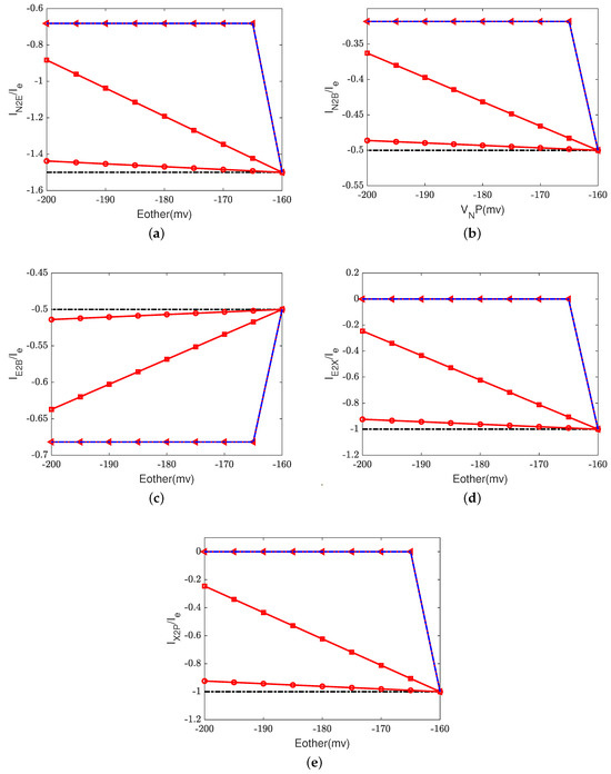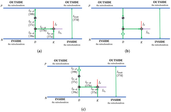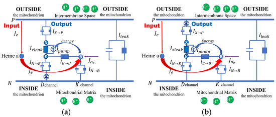 Here, we discuss two cases. In one case, a rectifier between N and E blocks the proton flows. In the other case, a rectifier between X and P blocks the backward proton flows. Then, the currents and are modeled in the following two cases.