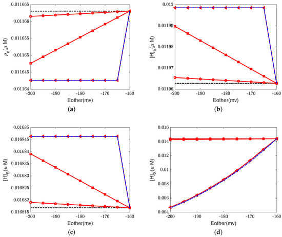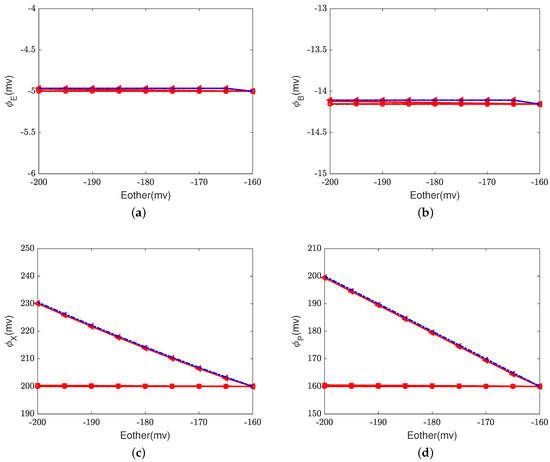 For simplicity, we follow the Hodgkin–Huxley tradition and fix the proton concentrations in the mitochondrial matrix (inside) and the inter-membrane space outside the mitochondria so they do not vary with time or flow. More general treatments in which concentrations are changed with time by flow are possible, as performed in even more complex structures. Such analyses have been conducted in a bi-domain model of the lens of the eye and a tri-domain model of the optic nerve and glia [81,82,83,84].