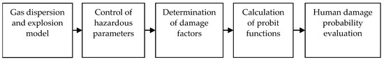 An accidental release of hydrogen at an industrial site is usually accompanied by the formation of a hydrogen–air mixture, which can explode under the influence of external factors. The resulting explosion wave spreads through the site, causing a shock-impulse load on humans and leading to harmful consequences for their health (Figure 1).