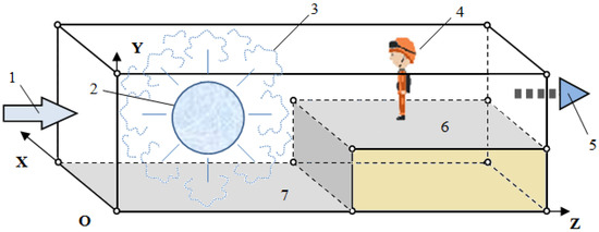 A computer model of the hydrogen–air cloud explosion: 1: inlet air; 2: hydrogen cloud; 3: combustion products; 4: personnel; 5: output mixture; 6: working place terrain level; 7: explosion terrain level.