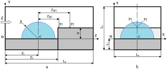 A scheme of the calculated area in planes YOZ (a) and YOX (b).