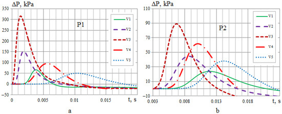 Maximum overpressure at control points: (a) point P1; (b) point P2.