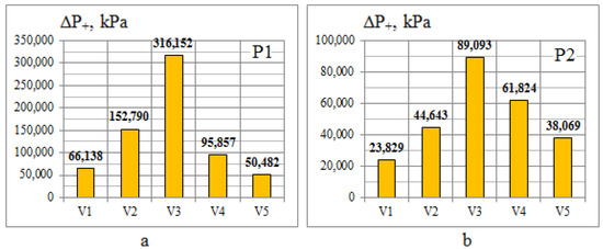 The collected data allow us to extract all the information needed to evaluate the damaging factors of the explosion shock wave (maximum overpressure (Figure 8) and compression phase impulse (Figure 9)) and to calculate the values of the conditional probability of lethal consequences (Figure 10) according to formula (2) as well as eardrum rupture (Figure 11) according to formula (3) at control points P1 and P2 for different terrain options V1–V5.
