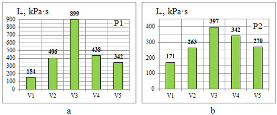 Compression phase impulse I+ at control points: (a) point P1; (b) point P2.