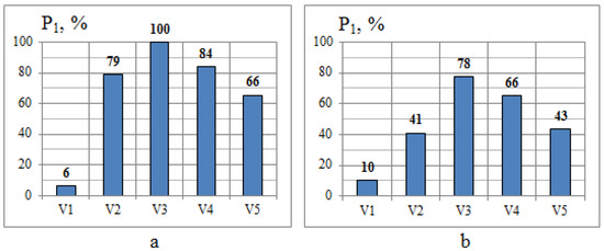 The total effect from maximum overpressure and impulse loads can be clearly seen in Figure 10 for lethal probabilities in control points, and in Figure 12, Figure 13, Figure 14, Figure 15 and Figure 16 for the fields of this consequence parameter. Higher levels of options V2 and V1 better protect humans than deeper variants of terrain, especially in point P2 (Figure 10b, Figure 12b, Figure 13b, Figure 14b, Figure 15b and Figure 16b). This conclusion can be confirmed by such safety characteristics as an area S50 of dangerously high values (> 50%) of the conditional lethal probability (Figure 17) on the surface of the level-two part of the industrial site (working place). It is clearly seen that higher-level variants V2 and V1 protect the working place much more effectively than deeper level variants V4 and V5 of landscape in relation to variant V3 with evenly leveled terrain.