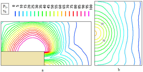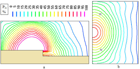 Non-stationary pressure distributions in vertical cross-section YOZ (Figure 6) can give us a clue as to why probable consequences for humans in control points behave in such a manner. Deepening the relief level of the accident epicenter related to control points level (Figure 6a,b) leads to higher obstacles in front of the pressure wave and a bigger reflecting effect. Deepening the relief level of control points related to the accident epicenter level (Figure 6d,e) leads to break-away and reattachment to the Earth of the pressure wave and a bigger expansion effect. The most dangerous option is an evenly leveled relief (Figure 6c) because the control points are openly exposed to the shock-impulse load.