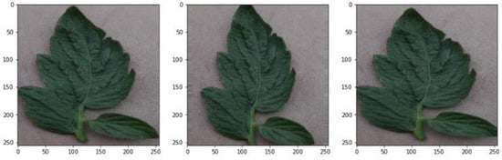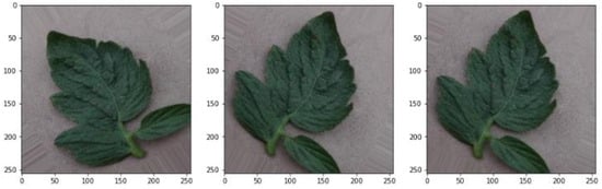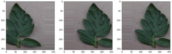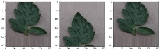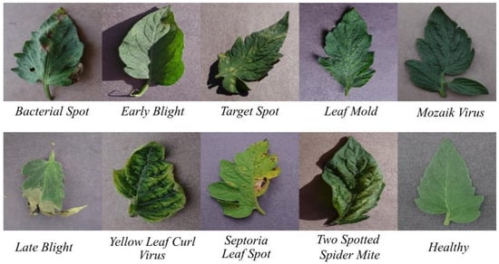 The data in this study was image data of diseases on tomato plant leaves taken from the Kaggle website The data were obtained by downloading it from https://www.kaggle.com/datasets/kaustubhb999/tomatoleaf, accessed on 3 November 2022. There are 1000 types of images for each type of disease on tomato plant leaves. By taking 10 disease classes, data from 10,000 images were obtained. Figure 1 is a sample of each disease on tomato plant leaves. Each image’s dimensions are 256 by 256. Both the horizontal and vertical resolutions are 96 dpi. The bit depth is 24.
