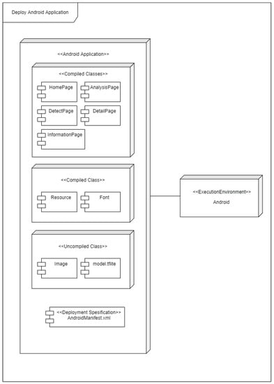 After locating the ideal model, the next stage was to develop an application for end users. The construction of the application utilized the Android platform and the Flutter application development framework. We incorporated the best model from the previous phase into the Android-based application. Figure 7 illustrates the deployment diagram. The Android program and the execution environment are the two nodes. There are four sections in the Android application section: compiled classes, compiled resources, uncompiled resources, and deployment specifications. This is the portion of the code that is run in the execution environment.