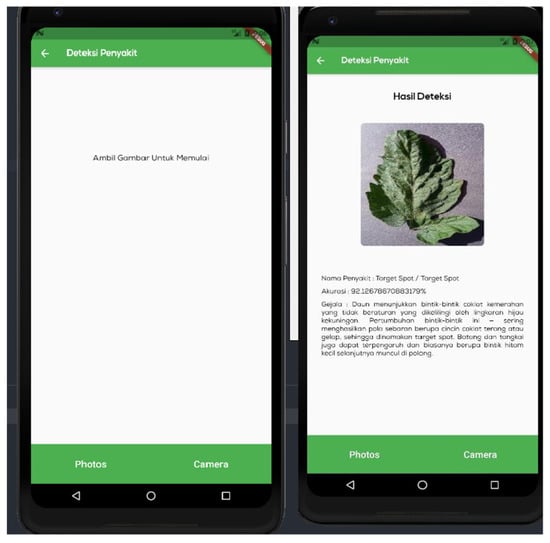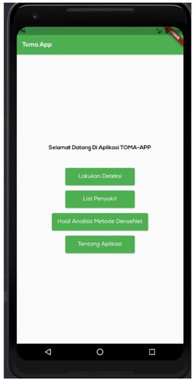 After identifying the optimal model, the authors of this study created an Android-based mobile application. The intended audience consisted of Indonesian farmers, hence the instructional language was Indonesian. Four primary menus make up the application: disease detection, disease list, analysis findings, and application description. Figure 9 depicts the home page.