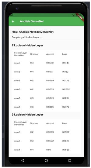 Figure 10 shows the ‘disease detection’ menu, which is a page for detecting illnesses on the leaves of tomato plants. On this page, the user will enter data to be processed by the DenseNet model. The model will detect the ailment that most closely corresponds to the visual input. There are two methods for importing photos: the camera and the gallery. Figure 11 shows an ‘analysis results’ menu, which is the page displaying the outcomes of the conducted trials. This page contains a performance table of the model for each tested hyperparameter. Three hyperparameters, namely, the hidden layer, the dropout rate, and the trainable dense layer, are evaluated.
