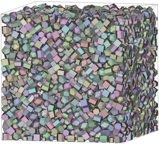 - Li, J.; An, X.; Wang, J.; Zhao, H.; Zou, R.; Dong, K.; Gou, D. Experimental study on 3D vibrated packing densification of mono-sized dodecahedral particles. Powder Technol. 2020, 367, 703–712. [Google Scholar] [CrossRef]