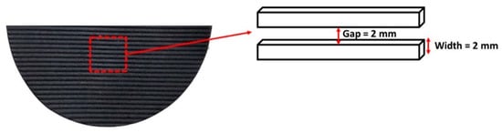 The considered variables were measured over the heel region measuring 50 mm from the posterior point, and have been reported previously to be sufficient in determining the traction performance of shoes [,,,,]. The material of the outsole was identified as polyurethane with a Shore A hardness of 50. The tread measurements were recorded and imported in a CAD modeling software (SolidWorks, Dassault Systèmes, Vélizy-Villacoublay, France). The original outsole had a tread width of 2 mm with an interval gap of 2 mm (Figure 1). Furthermore, the widths and gaps were modified systematically with an interval of 2 mm and 1 mm, respectively, with the depth maintained as a constant (i.e., 2 mm). Table 1 lists the different parametrical modifications conducted on the tread design.