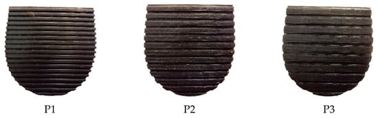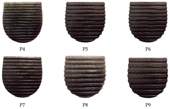 To fabricate the outsoles, molds of nine parametrically generated models were 3D printed using an enclosed 3D printer (Voxelab Aquila, Flashforge, Jinhua City, Zhejiang Province, China). The 3D printer was a bouden-type enclosed printer and had a bed size of 220 × 220 mm. To print the PLA molds, an extrusion temperature of 200 °C and bed temperature of 60 °C was applied. As the outsole treads included intricate corners, the molds were printed at a low extrusion and speed (i.e., 25 mm/s). The molds were filled with a hydrophobic pourable liquid silicone (LSR 130, Chemzest Products, India). The silicone was left to dry for 7 h and was taken out from the respective molds. A two-part polyurethane was poured into the negative silicone molds and left to cure for 48 h. The employed polyurethane material had a Shore A hardness of 50 to match the original footwear material properties. After the removal of the developed outsoles, extra edges were trimmed and re-measured for their dimensions. Additionally, the resulting shore hardness was confirmed using the durometer. Figure 2 represents the nine footwear outsole designs.