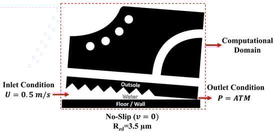 The surface beneath the outsole (i.e., floor) was modelled as a stationary surface with no slip boundary condition. The surface roughness of the wall was applied as 3.5 µm, mimicking the actual experimental conditions. The measured surface roughness was modified as equivalent to sand grain roughness based on a previous study [] (Equation (8)).
